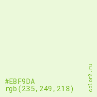 Цвет #EBF9DA в цветовой модели RGB обозначается тремя октетами (235, 249, 218) в десятичном формате и #EBF9DA в шестнадцатиричном (hex) формате, которые являются интенсивностью красного 235 (hex EB), интенсивность зелёного 249 (hex F9) и интенсивность синего 218 (hex DA).