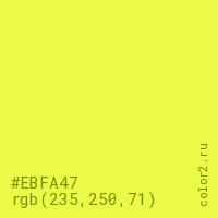 Цвет #EBFA47 в цветовой модели RGB обозначается тремя октетами (235, 250, 71) в десятичном формате и #EBFA47 в шестнадцатиричном (hex) формате, которые являются интенсивностью красного 235 (hex EB), интенсивность зелёного 250 (hex FA) и интенсивность синего 71 (hex 47).