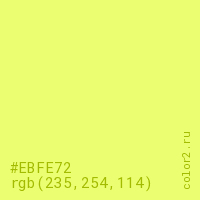 Цвет #EBFE72 в цветовой модели RGB обозначается тремя октетами (235, 254, 114) в десятичном формате и #EBFE72 в шестнадцатиричном (hex) формате, которые являются интенсивностью красного 235 (hex EB), интенсивность зелёного 254 (hex FE) и интенсивность синего 114 (hex 72).