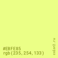 Цвет #EBFE85 в цветовой модели RGB обозначается тремя октетами (235, 254, 133) в десятичном формате и #EBFE85 в шестнадцатиричном (hex) формате, которые являются интенсивностью красного 235 (hex EB), интенсивность зелёного 254 (hex FE) и интенсивность синего 133 (hex 85).