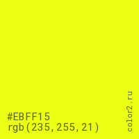 Цвет #EBFF15 в цветовой модели RGB обозначается тремя октетами (235, 255, 21) в десятичном формате и #EBFF15 в шестнадцатиричном (hex) формате, которые являются интенсивностью красного 235 (hex EB), интенсивность зелёного 255 (hex FF) и интенсивность синего 21 (hex 15).