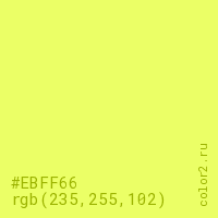 Цвет #EBFF66 в цветовой модели RGB обозначается тремя октетами (235, 255, 102) в десятичном формате и #EBFF66 в шестнадцатиричном (hex) формате, которые являются интенсивностью красного 235 (hex EB), интенсивность зелёного 255 (hex FF) и интенсивность синего 102 (hex 66).