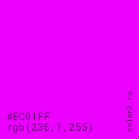 Цвет #EC01FF в цветовой модели RGB обозначается тремя октетами (236, 1, 255) в десятичном формате и #EC01FF в шестнадцатиричном (hex) формате, которые являются интенсивностью красного 236 (hex EC), интенсивность зелёного 1 (hex 01) и интенсивность синего 255 (hex FF).
