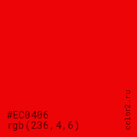Цвет #EC0406 в цветовой модели RGB обозначается тремя октетами (236, 4, 6) в десятичном формате и #EC0406 в шестнадцатиричном (hex) формате, которые являются интенсивностью красного 236 (hex EC), интенсивность зелёного 4 (hex 04) и интенсивность синего 6 (hex 06).