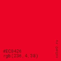 Цвет #EC0426 в цветовой модели RGB обозначается тремя октетами (236, 4, 38) в десятичном формате и #EC0426 в шестнадцатиричном (hex) формате, которые являются интенсивностью красного 236 (hex EC), интенсивность зелёного 4 (hex 04) и интенсивность синего 38 (hex 26).
