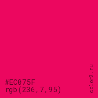 Цвет #EC075F в цветовой модели RGB обозначается тремя октетами (236, 7, 95) в десятичном формате и #EC075F в шестнадцатиричном (hex) формате, которые являются интенсивностью красного 236 (hex EC), интенсивность зелёного 7 (hex 07) и интенсивность синего 95 (hex 5F).
