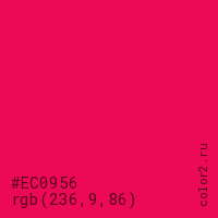 Цвет #EC0956 в цветовой модели RGB обозначается тремя октетами (236, 9, 86) в десятичном формате и #EC0956 в шестнадцатиричном (hex) формате, которые являются интенсивностью красного 236 (hex EC), интенсивность зелёного 9 (hex 09) и интенсивность синего 86 (hex 56).