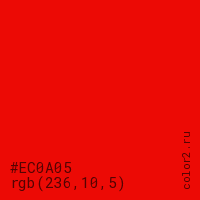 Цвет #EC0A05 в цветовой модели RGB обозначается тремя октетами (236, 10, 5) в десятичном формате и #EC0A05 в шестнадцатиричном (hex) формате, которые являются интенсивностью красного 236 (hex EC), интенсивность зелёного 10 (hex 0A) и интенсивность синего 5 (hex 05).