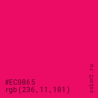 Цвет #EC0B65 в цветовой модели RGB обозначается тремя октетами (236, 11, 101) в десятичном формате и #EC0B65 в шестнадцатиричном (hex) формате, которые являются интенсивностью красного 236 (hex EC), интенсивность зелёного 11 (hex 0B) и интенсивность синего 101 (hex 65).