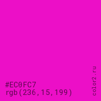 Цвет #EC0FC7 в цветовой модели RGB обозначается тремя октетами (236, 15, 199) в десятичном формате и #EC0FC7 в шестнадцатиричном (hex) формате, которые являются интенсивностью красного 236 (hex EC), интенсивность зелёного 15 (hex 0F) и интенсивность синего 199 (hex C7).