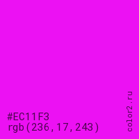 Цвет #EC11F3 в цветовой модели RGB обозначается тремя октетами (236, 17, 243) в десятичном формате и #EC11F3 в шестнадцатиричном (hex) формате, которые являются интенсивностью красного 236 (hex EC), интенсивность зелёного 17 (hex 11) и интенсивность синего 243 (hex F3).