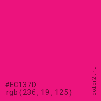 Цвет #EC137D в цветовой модели RGB обозначается тремя октетами (236, 19, 125) в десятичном формате и #EC137D в шестнадцатиричном (hex) формате, которые являются интенсивностью красного 236 (hex EC), интенсивность зелёного 19 (hex 13) и интенсивность синего 125 (hex 7D).