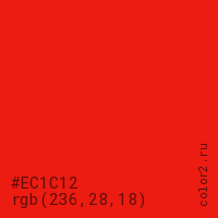 Цвет #EC1C12 в цветовой модели RGB обозначается тремя октетами (236, 28, 18) в десятичном формате и #EC1C12 в шестнадцатиричном (hex) формате, которые являются интенсивностью красного 236 (hex EC), интенсивность зелёного 28 (hex 1C) и интенсивность синего 18 (hex 12).