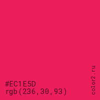 Цвет #EC1E5D в цветовой модели RGB обозначается тремя октетами (236, 30, 93) в десятичном формате и #EC1E5D в шестнадцатиричном (hex) формате, которые являются интенсивностью красного 236 (hex EC), интенсивность зелёного 30 (hex 1E) и интенсивность синего 93 (hex 5D).