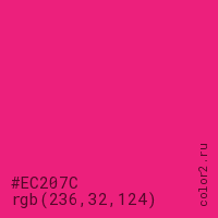 Цвет #EC207C в цветовой модели RGB обозначается тремя октетами (236, 32, 124) в десятичном формате и #EC207C в шестнадцатиричном (hex) формате, которые являются интенсивностью красного 236 (hex EC), интенсивность зелёного 32 (hex 20) и интенсивность синего 124 (hex 7C).