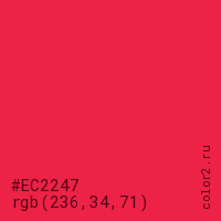 Цвет #EC2247 в цветовой модели RGB обозначается тремя октетами (236, 34, 71) в десятичном формате и #EC2247 в шестнадцатиричном (hex) формате, которые являются интенсивностью красного 236 (hex EC), интенсивность зелёного 34 (hex 22) и интенсивность синего 71 (hex 47).