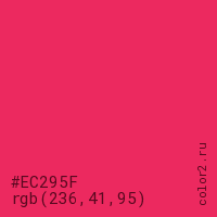 Цвет #EC295F в цветовой модели RGB обозначается тремя октетами (236, 41, 95) в десятичном формате и #EC295F в шестнадцатиричном (hex) формате, которые являются интенсивностью красного 236 (hex EC), интенсивность зелёного 41 (hex 29) и интенсивность синего 95 (hex 5F).