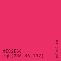 Цвет #EC2E66 в цветовой модели RGB обозначается тремя октетами (236, 46, 102) в десятичном формате и #EC2E66 в шестнадцатиричном (hex) формате, которые являются интенсивностью красного 236 (hex EC), интенсивность зелёного 46 (hex 2E) и интенсивность синего 102 (hex 66).