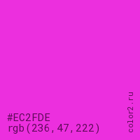 Цвет #EC2FDE в цветовой модели RGB обозначается тремя октетами (236, 47, 222) в десятичном формате и #EC2FDE в шестнадцатиричном (hex) формате, которые являются интенсивностью красного 236 (hex EC), интенсивность зелёного 47 (hex 2F) и интенсивность синего 222 (hex DE).