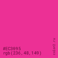 Цвет #EC3095 в цветовой модели RGB обозначается тремя октетами (236, 48, 149) в десятичном формате и #EC3095 в шестнадцатиричном (hex) формате, которые являются интенсивностью красного 236 (hex EC), интенсивность зелёного 48 (hex 30) и интенсивность синего 149 (hex 95).