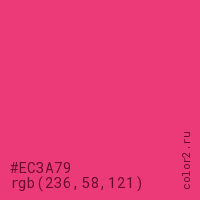 Цвет #EC3A79 в цветовой модели RGB обозначается тремя октетами (236, 58, 121) в десятичном формате и #EC3A79 в шестнадцатиричном (hex) формате, которые являются интенсивностью красного 236 (hex EC), интенсивность зелёного 58 (hex 3A) и интенсивность синего 121 (hex 79).