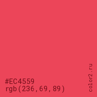 Цвет #EC4559 в цветовой модели RGB обозначается тремя октетами (236, 69, 89) в десятичном формате и #EC4559 в шестнадцатиричном (hex) формате, которые являются интенсивностью красного 236 (hex EC), интенсивность зелёного 69 (hex 45) и интенсивность синего 89 (hex 59).