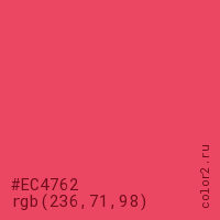 Цвет #EC4762 в цветовой модели RGB обозначается тремя октетами (236, 71, 98) в десятичном формате и #EC4762 в шестнадцатиричном (hex) формате, которые являются интенсивностью красного 236 (hex EC), интенсивность зелёного 71 (hex 47) и интенсивность синего 98 (hex 62).