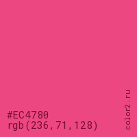 Цвет #EC4780 в цветовой модели RGB обозначается тремя октетами (236, 71, 128) в десятичном формате и #EC4780 в шестнадцатиричном (hex) формате, которые являются интенсивностью красного 236 (hex EC), интенсивность зелёного 71 (hex 47) и интенсивность синего 128 (hex 80).