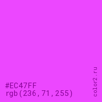 Цвет #EC47FF в цветовой модели RGB обозначается тремя октетами (236, 71, 255) в десятичном формате и #EC47FF в шестнадцатиричном (hex) формате, которые являются интенсивностью красного 236 (hex EC), интенсивность зелёного 71 (hex 47) и интенсивность синего 255 (hex FF).