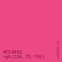 Цвет #EC4982 в цветовой модели RGB обозначается тремя октетами (236, 73, 130) в десятичном формате и #EC4982 в шестнадцатиричном (hex) формате, которые являются интенсивностью красного 236 (hex EC), интенсивность зелёного 73 (hex 49) и интенсивность синего 130 (hex 82).