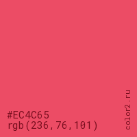 Цвет #EC4C65 в цветовой модели RGB обозначается тремя октетами (236, 76, 101) в десятичном формате и #EC4C65 в шестнадцатиричном (hex) формате, которые являются интенсивностью красного 236 (hex EC), интенсивность зелёного 76 (hex 4C) и интенсивность синего 101 (hex 65).