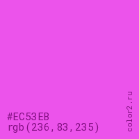Цвет #EC53EB в цветовой модели RGB обозначается тремя октетами (236, 83, 235) в десятичном формате и #EC53EB в шестнадцатиричном (hex) формате, которые являются интенсивностью красного 236 (hex EC), интенсивность зелёного 83 (hex 53) и интенсивность синего 235 (hex EB).