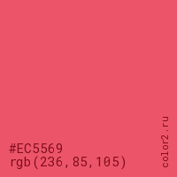 Цвет #EC5569 в цветовой модели RGB обозначается тремя октетами (236, 85, 105) в десятичном формате и #EC5569 в шестнадцатиричном (hex) формате, которые являются интенсивностью красного 236 (hex EC), интенсивность зелёного 85 (hex 55) и интенсивность синего 105 (hex 69).