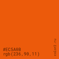 Цвет #EC5A0B в цветовой модели RGB обозначается тремя октетами (236, 90, 11) в десятичном формате и #EC5A0B в шестнадцатиричном (hex) формате, которые являются интенсивностью красного 236 (hex EC), интенсивность зелёного 90 (hex 5A) и интенсивность синего 11 (hex 0B).