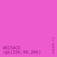 Цвет #EC5ACE в цветовой модели RGB обозначается тремя октетами (236, 90, 206) в десятичном формате и #EC5ACE в шестнадцатиричном (hex) формате, которые являются интенсивностью красного 236 (hex EC), интенсивность зелёного 90 (hex 5A) и интенсивность синего 206 (hex CE).