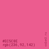 Цвет #EC5C8E в цветовой модели RGB обозначается тремя октетами (236, 92, 142) в десятичном формате и #EC5C8E в шестнадцатиричном (hex) формате, которые являются интенсивностью красного 236 (hex EC), интенсивность зелёного 92 (hex 5C) и интенсивность синего 142 (hex 8E).