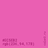 Цвет #EC5EB2 в цветовой модели RGB обозначается тремя октетами (236, 94, 178) в десятичном формате и #EC5EB2 в шестнадцатиричном (hex) формате, которые являются интенсивностью красного 236 (hex EC), интенсивность зелёного 94 (hex 5E) и интенсивность синего 178 (hex B2).