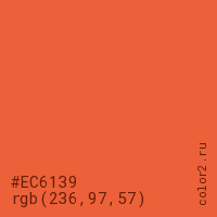 Цвет #EC6139 в цветовой модели RGB обозначается тремя октетами (236, 97, 57) в десятичном формате и #EC6139 в шестнадцатиричном (hex) формате, которые являются интенсивностью красного 236 (hex EC), интенсивность зелёного 97 (hex 61) и интенсивность синего 57 (hex 39).