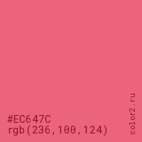 Цвет #EC647C в цветовой модели RGB обозначается тремя октетами (236, 100, 124) в десятичном формате и #EC647C в шестнадцатиричном (hex) формате, которые являются интенсивностью красного 236 (hex EC), интенсивность зелёного 100 (hex 64) и интенсивность синего 124 (hex 7C).
