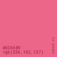 Цвет #EC6689 в цветовой модели RGB обозначается тремя октетами (236, 102, 137) в десятичном формате и #EC6689 в шестнадцатиричном (hex) формате, которые являются интенсивностью красного 236 (hex EC), интенсивность зелёного 102 (hex 66) и интенсивность синего 137 (hex 89).