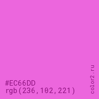 Цвет #EC66DD в цветовой модели RGB обозначается тремя октетами (236, 102, 221) в десятичном формате и #EC66DD в шестнадцатиричном (hex) формате, которые являются интенсивностью красного 236 (hex EC), интенсивность зелёного 102 (hex 66) и интенсивность синего 221 (hex DD).