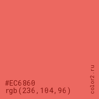 Цвет #EC6860 в цветовой модели RGB обозначается тремя октетами (236, 104, 96) в десятичном формате и #EC6860 в шестнадцатиричном (hex) формате, которые являются интенсивностью красного 236 (hex EC), интенсивность зелёного 104 (hex 68) и интенсивность синего 96 (hex 60).