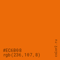 Цвет #EC6B08 в цветовой модели RGB обозначается тремя октетами (236, 107, 8) в десятичном формате и #EC6B08 в шестнадцатиричном (hex) формате, которые являются интенсивностью красного 236 (hex EC), интенсивность зелёного 107 (hex 6B) и интенсивность синего 8 (hex 08).