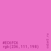 Цвет #EC6FC6 в цветовой модели RGB обозначается тремя октетами (236, 111, 198) в десятичном формате и #EC6FC6 в шестнадцатиричном (hex) формате, которые являются интенсивностью красного 236 (hex EC), интенсивность зелёного 111 (hex 6F) и интенсивность синего 198 (hex C6).