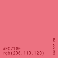 Цвет #EC7180 в цветовой модели RGB обозначается тремя октетами (236, 113, 128) в десятичном формате и #EC7180 в шестнадцатиричном (hex) формате, которые являются интенсивностью красного 236 (hex EC), интенсивность зелёного 113 (hex 71) и интенсивность синего 128 (hex 80).