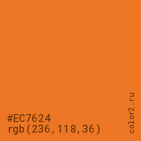 Цвет #EC7624 в цветовой модели RGB обозначается тремя октетами (236, 118, 36) в десятичном формате и #EC7624 в шестнадцатиричном (hex) формате, которые являются интенсивностью красного 236 (hex EC), интенсивность зелёного 118 (hex 76) и интенсивность синего 36 (hex 24).