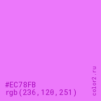 Цвет #EC78FB в цветовой модели RGB обозначается тремя октетами (236, 120, 251) в десятичном формате и #EC78FB в шестнадцатиричном (hex) формате, которые являются интенсивностью красного 236 (hex EC), интенсивность зелёного 120 (hex 78) и интенсивность синего 251 (hex FB).