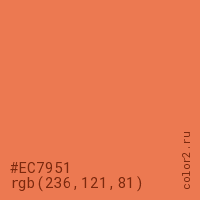 Цвет #EC7951 в цветовой модели RGB обозначается тремя октетами (236, 121, 81) в десятичном формате и #EC7951 в шестнадцатиричном (hex) формате, которые являются интенсивностью красного 236 (hex EC), интенсивность зелёного 121 (hex 79) и интенсивность синего 81 (hex 51).