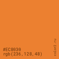 Цвет #EC8030 в цветовой модели RGB обозначается тремя октетами (236, 128, 48) в десятичном формате и #EC8030 в шестнадцатиричном (hex) формате, которые являются интенсивностью красного 236 (hex EC), интенсивность зелёного 128 (hex 80) и интенсивность синего 48 (hex 30).