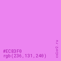 Цвет RGB(236, 131, 240) в процентом отношении количества цвета состоит из 92.5% красного (red), 51.4% зелёного (green) и 94.1% синего (blue).